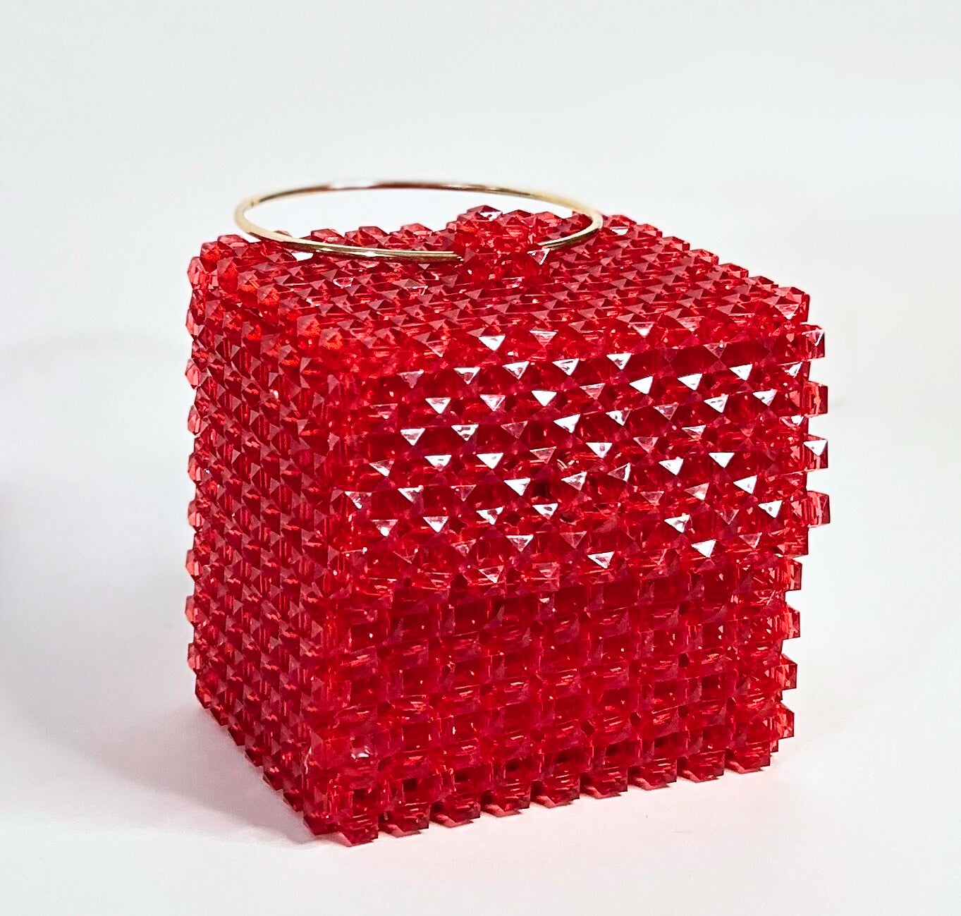 This extraordinary clutch features a distinct cubic silhouette, meticulously handcrafted from hundreds of vibrant translucent crimson-red faceted beads. Each bead is a tiny jewel, creating an all-over spiked texture that brilliantly catches and reflects light, giving the bag an intense, fiery glow.